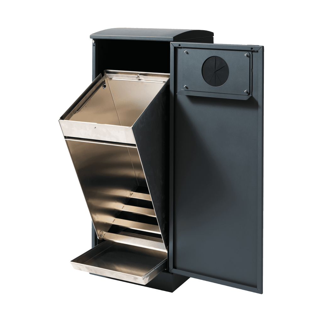 For at opnå et stilrent design, lang levetid og minimal vedligeholdelse er affaldsbeholderen fremstillet i pulverlakeret stål. De rene linjer i designet gør det til en affaldsbeholder, som naturligt kan indgå i indretningen. Ingen synlige fødder og hængsler sikrer et minimalistisk og elegant udtryk.