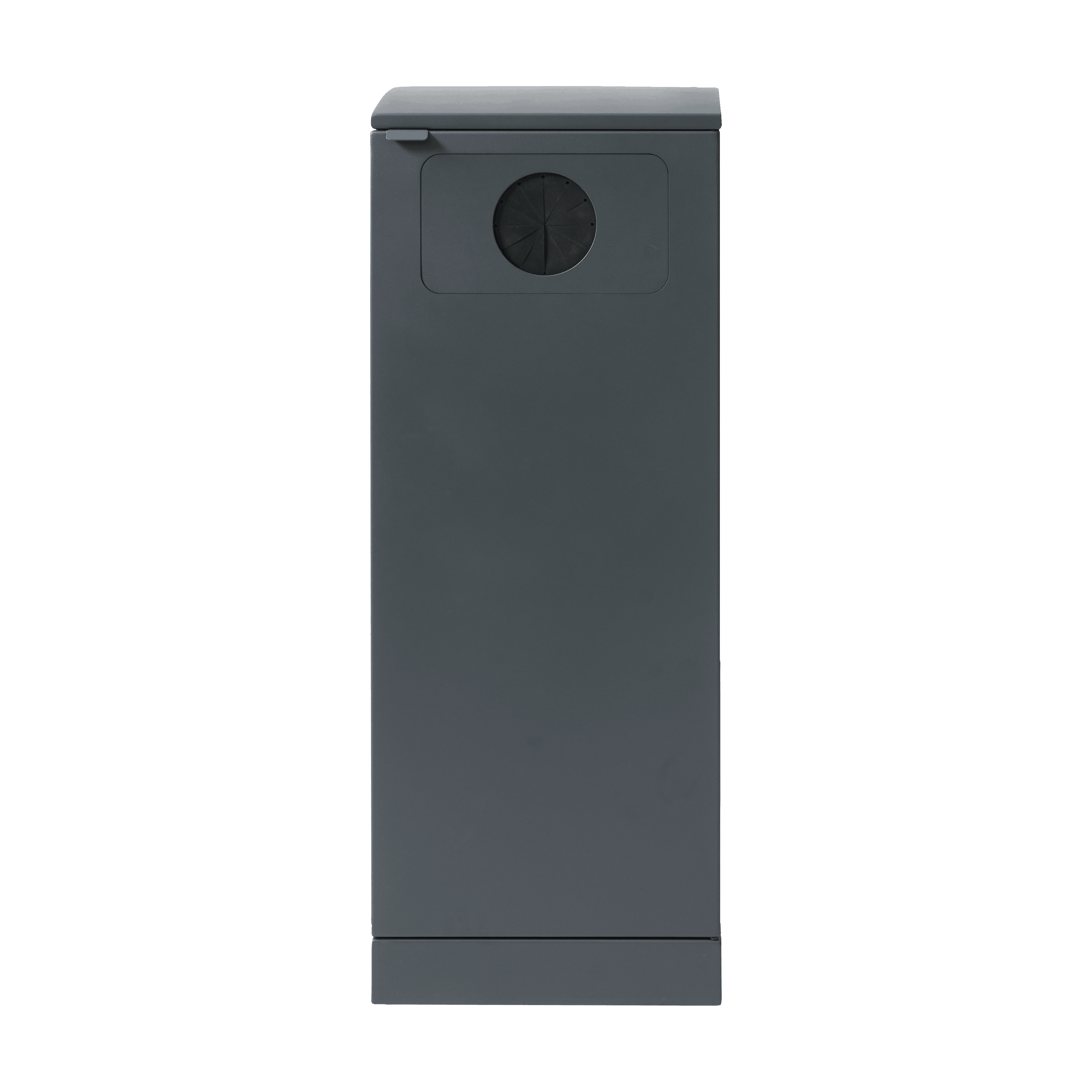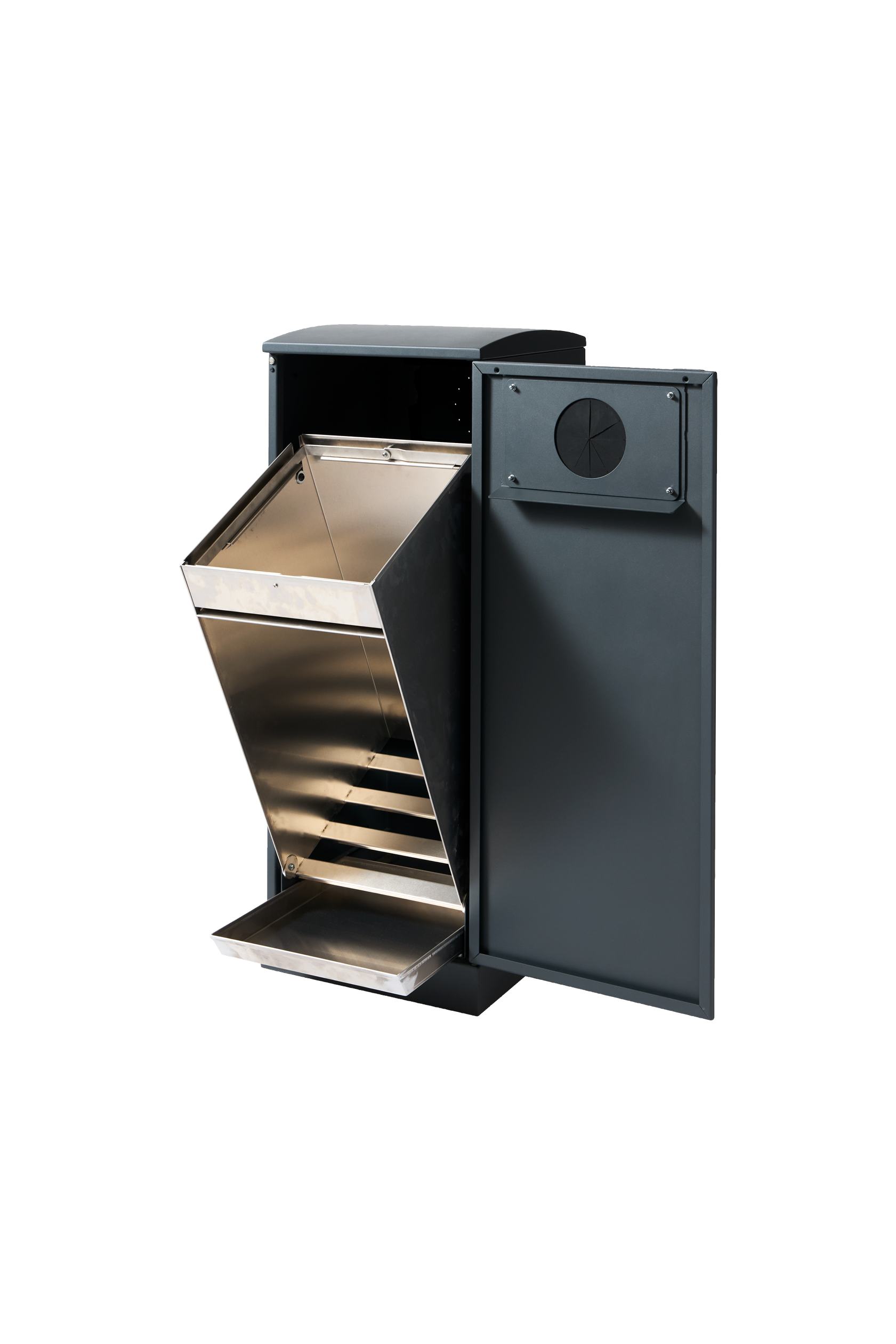 For at opnå et stilrent design, lang levetid og minimal vedligeholdelse er affaldsbeholderen fremstillet i pulverlakeret stål. De rene linjer i designet gør det til en affaldsbeholder, som naturligt kan indgå i indretningen. Ingen synlige fødder og hængsler sikrer et minimalistisk og elegant udtryk.