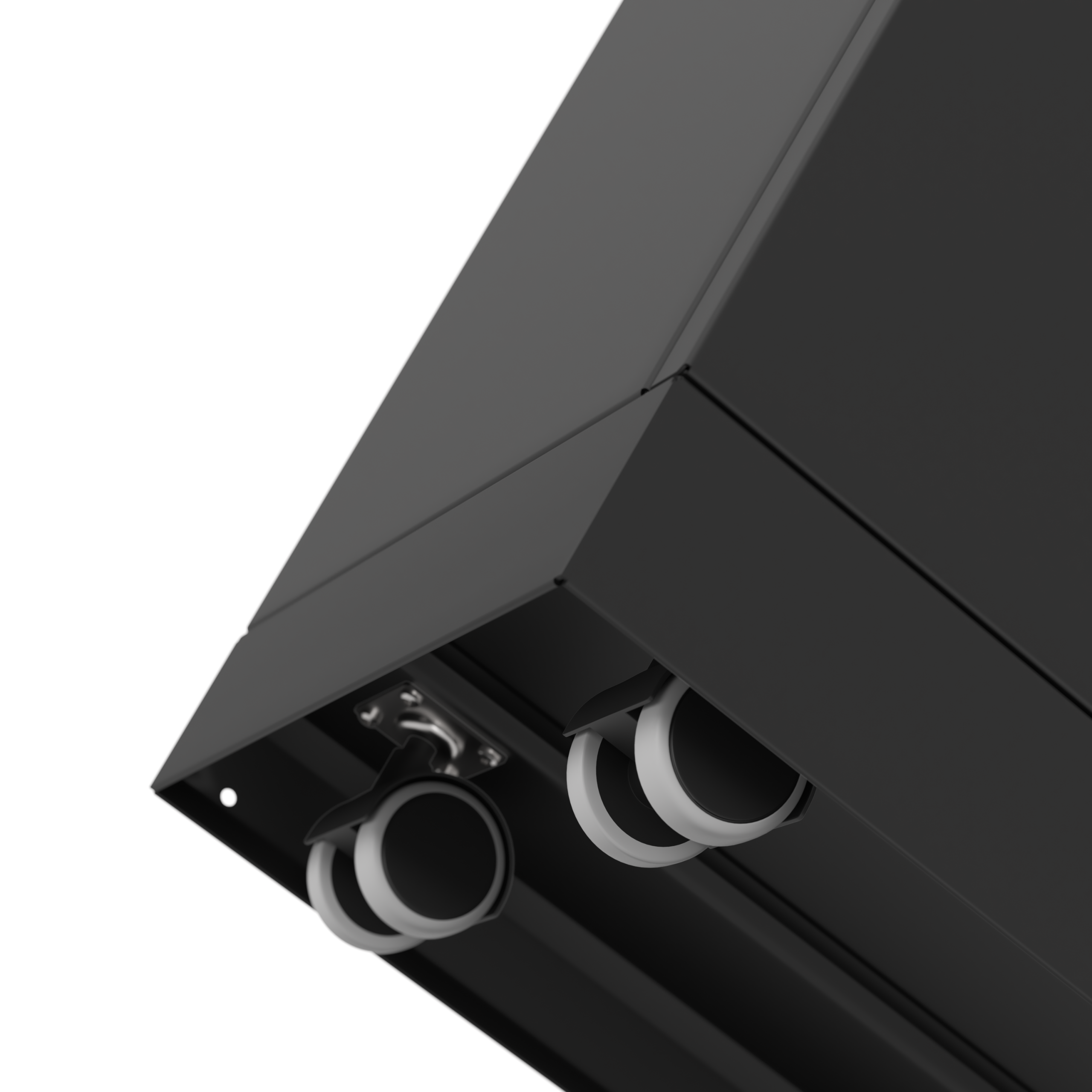 Affaldssystemet er designet med et stort låg, der åbnes ved tømning og som skjuler både inderbeholdere og poser. Affaldssystemet bevarer samtidigt et stilrent design takket være de skjulte hængsler og de monterede hjul diskret placeret bag soklen.