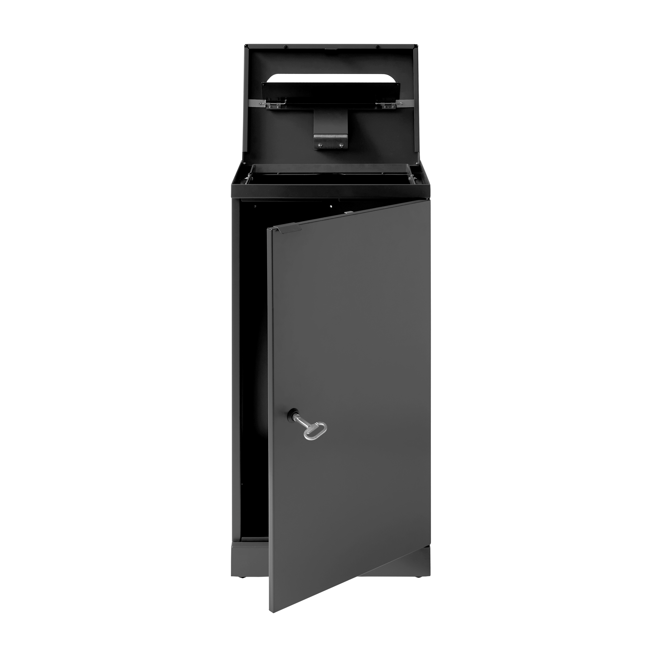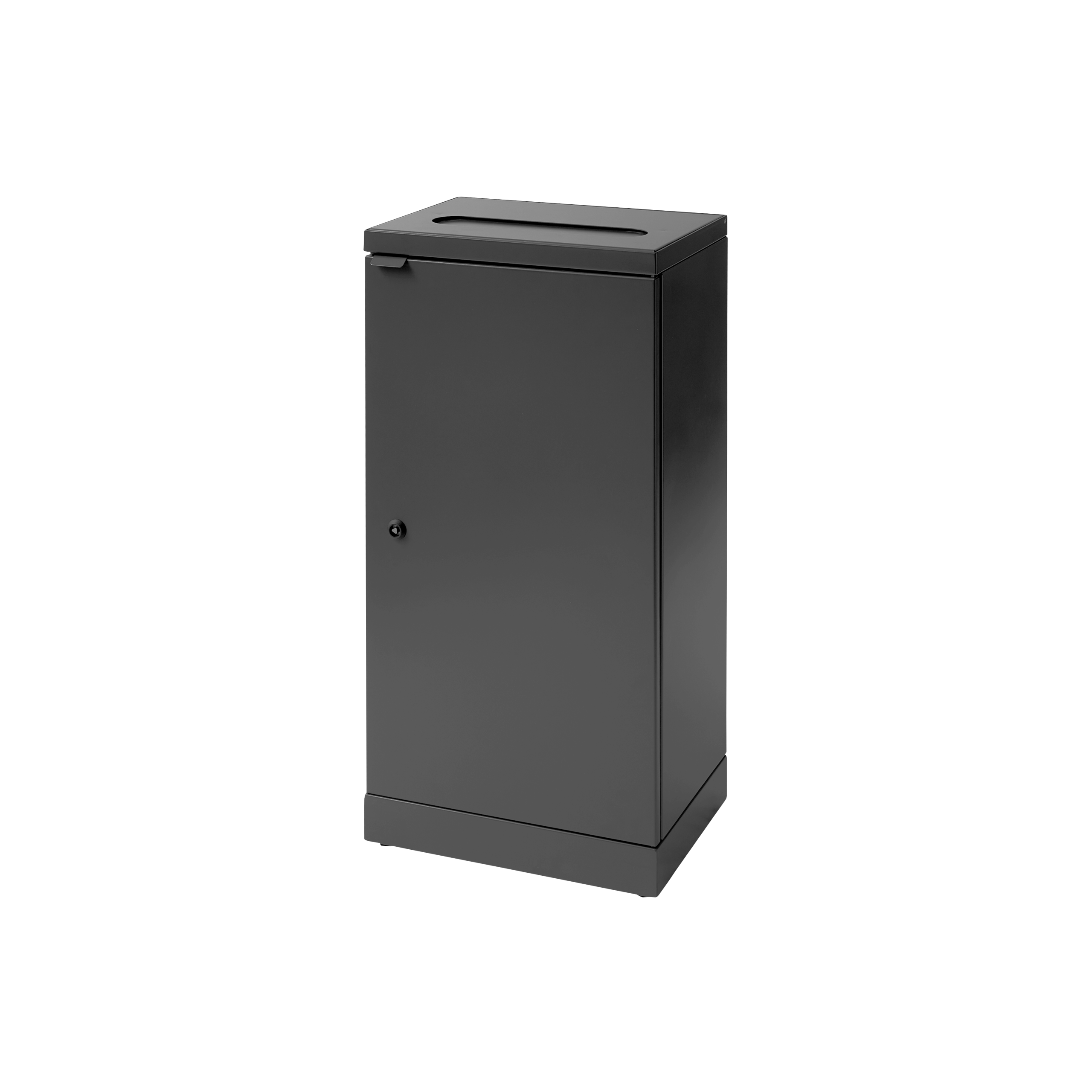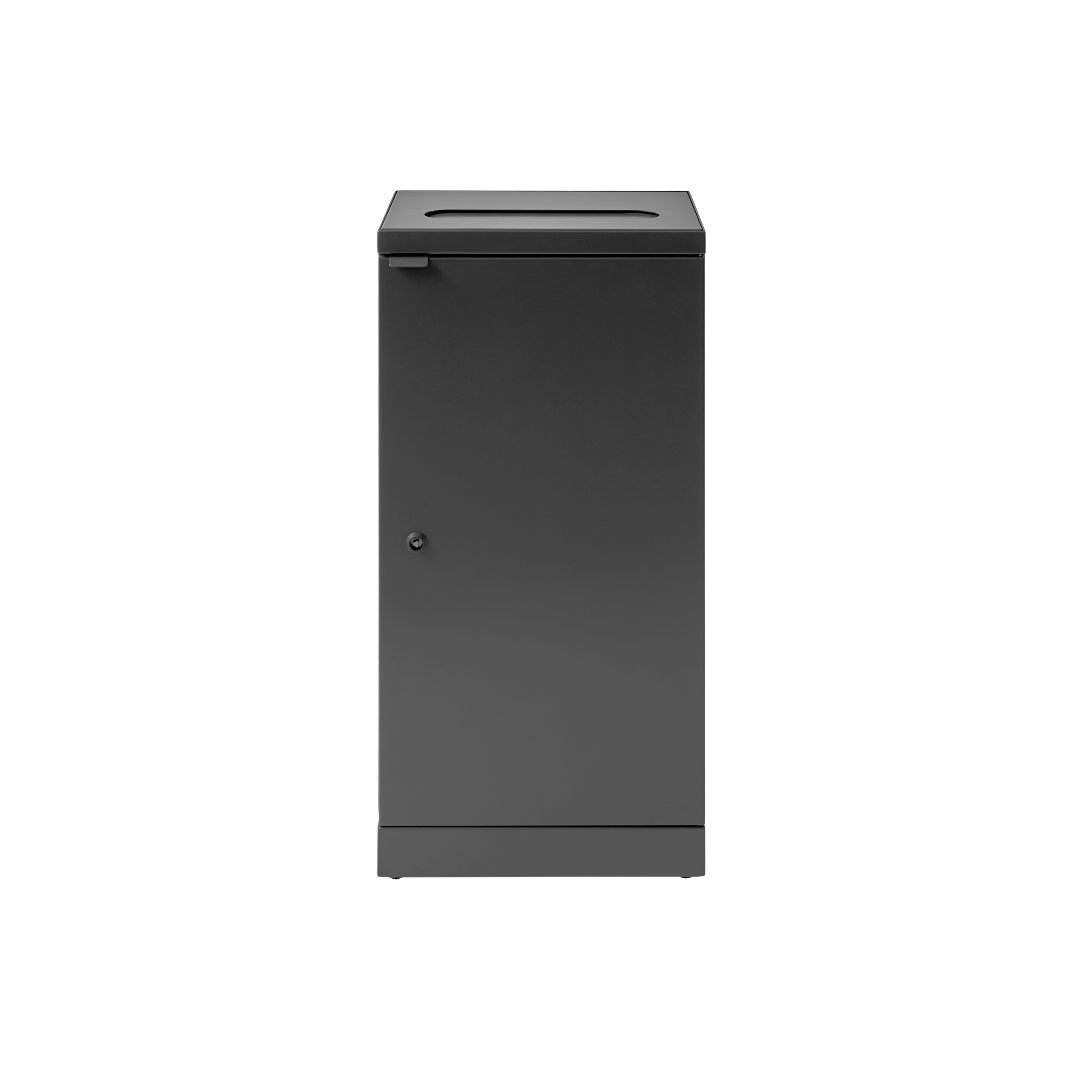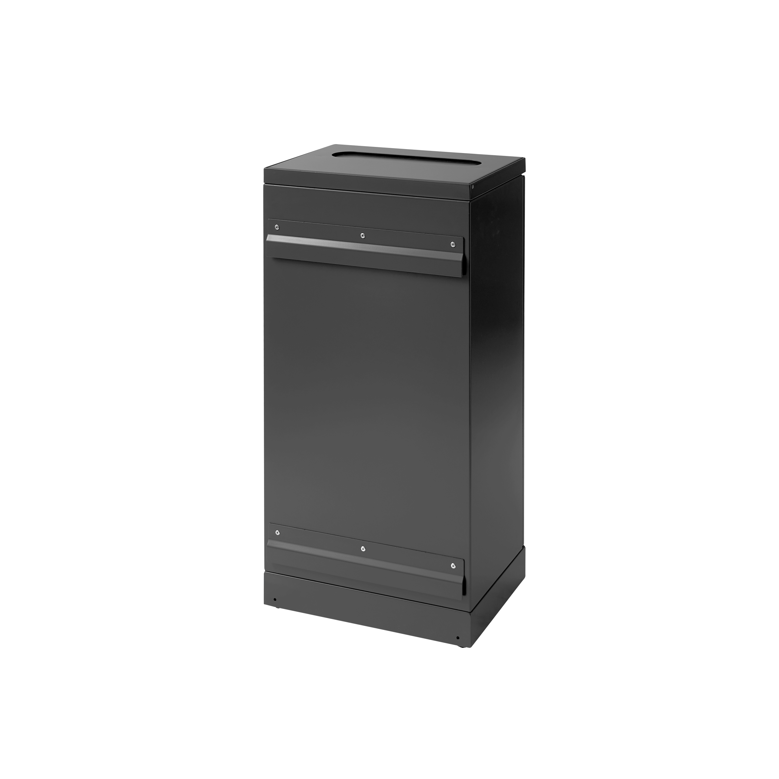 Affaldsbeholderen er udstyret med frontdøre for ergonomisk korrekt tømning uden tunge løft. Skraldespanden er udstyret med en integreret og stærk poseholder, så posen bliver siddende. Låget skjuler samtidig posen, så affaldsbeholderen bevarer et stilrent design. Affaldsbeholderen er udstyret med justerbare fødder, som er skjult bag soklen.