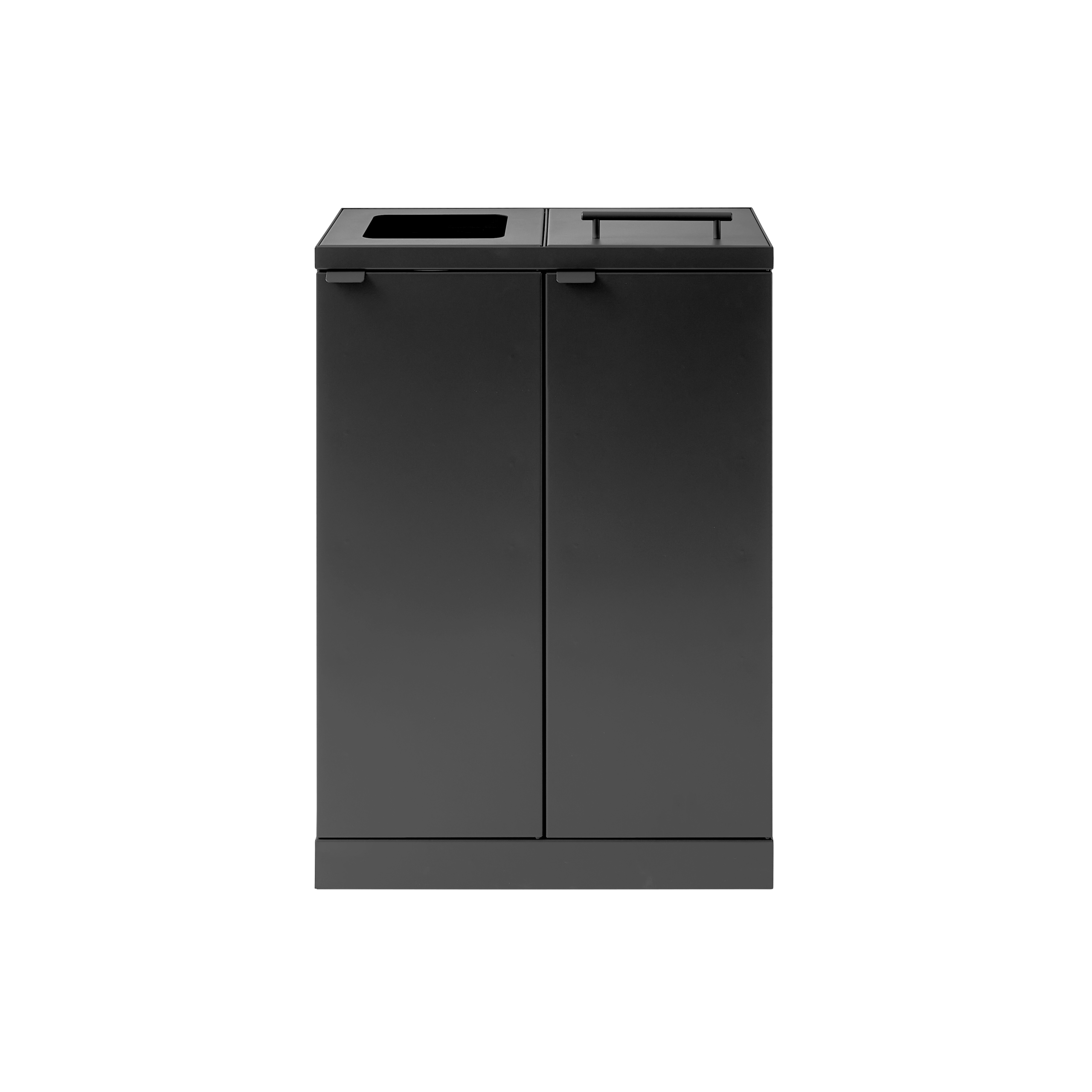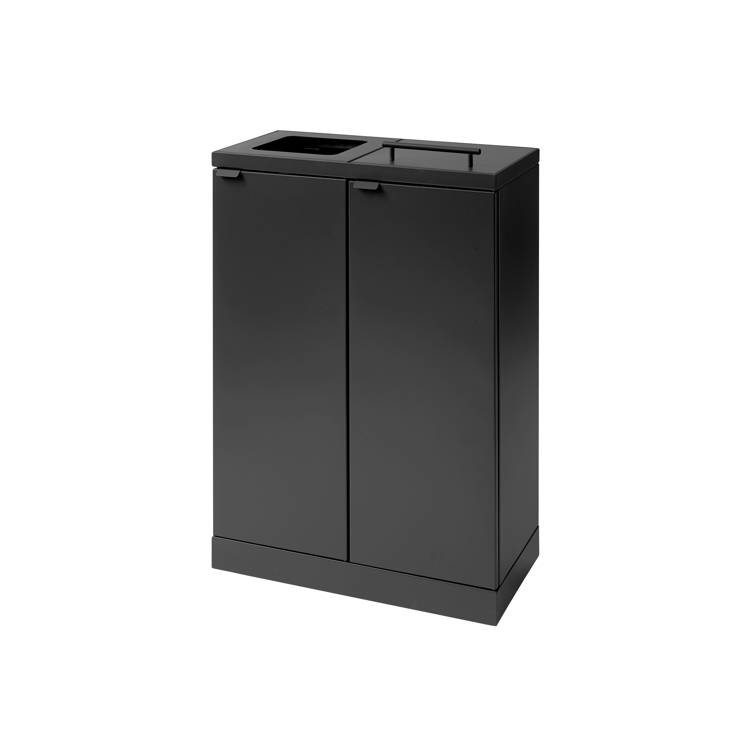 Affaldssystemet er udstyret med frontdøre med soft close for ergonomisk korrekt tømning uden tunge løft. Affaldssystemet er udstyret med integrerede og stærke poseholdere, så posen bliver siddende. Låget skjuler samtidig poserne, så affaldssystemet bevarer et stilrent design. Affaldssystemet er flytbart takket være de monterede hjul, som er skjult bag soklen. Affaldsløsningen leveres med et magnetisk vægbeslag, som den skal fikseres til.
