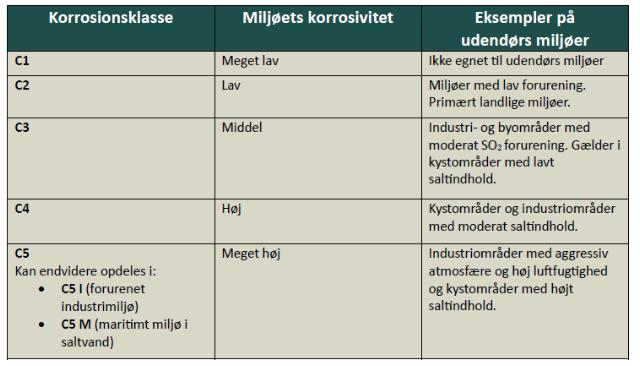 I nedenstående tabel er der en opsummering af korrosionsklasser fra ISO 12944, samt en beskrivelse af hvilke udendørs miljøer, hver korrosionsklasse er egnet til.